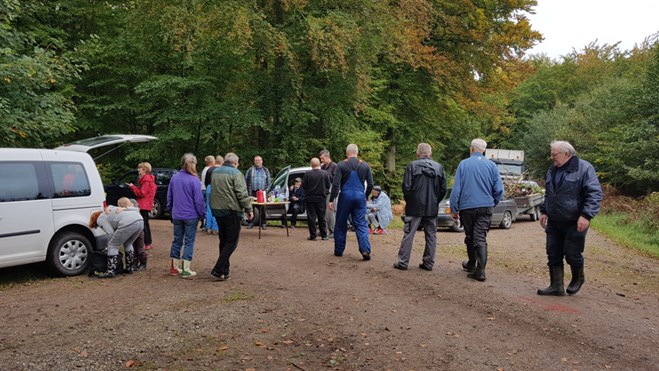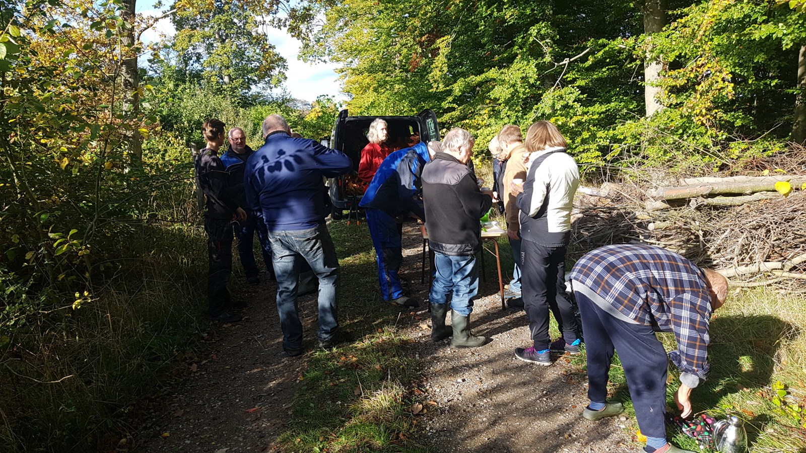 For nogle starter udstillingen med skovturen, som ligger en uge førend udstillingen åbner. Vi var igen heldige med vejret, og skoven var utrolig smuk idet der på grund af det milde vejr, var masser af blade på træerne, i de smukkeste efterårsfarver. Her en lille pause til de fremmødte medlemmer.
