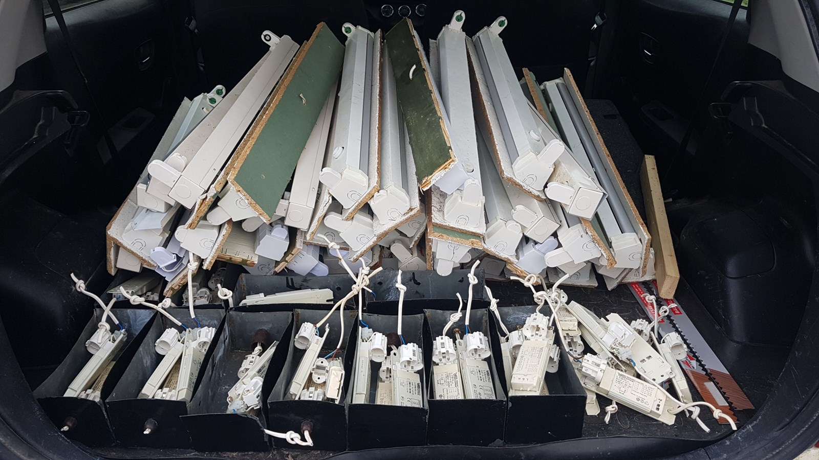 Ca. 80 gamle lysstofamarture og rør vejer godt til, og fylder en del. Det blev alt sammen kørt til genbrug mandag, efter udstillingen.