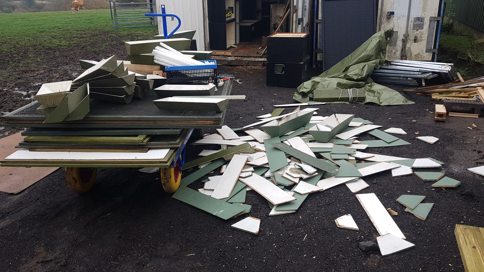 I forbindelse med udstillingen skulle der ryddes op i vores containere. Vi havde modtaget et større antal lamper og voliere fra Haslev Fugleforening. Det skulle der gøres plads til. Samtidig var der en masse gamle ting som ikke blev brugt mere. Claus brugte lørdagen og søndagen på at smide gamle stråmåtter, lys armaturer, samt gamle voliere ud. Lysstofrør og armaturer skulle skilles ad, så der var nok at lave. Men der var fint selskab, af et par lamaer og nogle køer, som til tider fulgte interesseret med.
