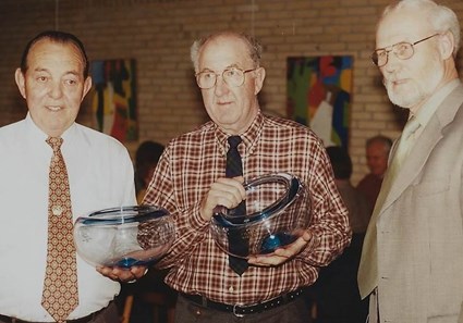 Carl Åge overrækker en vandrepokal til Allan Skov, ved Køge Fugleforenings 50 års jubilæumsfest, den 11. december 1985. Foto: Kirsten Skov
